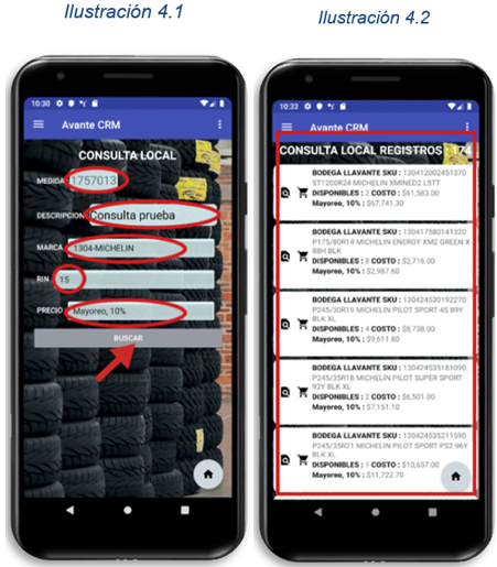1. Para buscar un producto en la ventana de consulta local posterior a cargar los inventarios puedes buscar todo el inventario o filtrar por medida, descripción, marca o rin y seleccionar un precio. Después presionar en el botón buscar. Ilustración 4.1